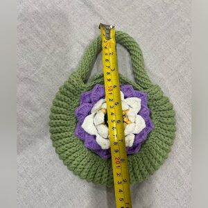 This brand new handcrafted knit handbag features a vibrant green color with a beautiful floral design. Perfect for adding a touch of elegance to any outfit.