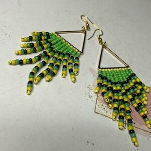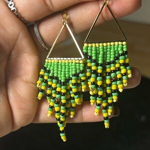 Add a pop of color to your outfit with these handcrafted Jamaican beaded triangle earrings. Featuring vibrant green and yellow beads, these earrings are perfect for any occasion.
