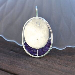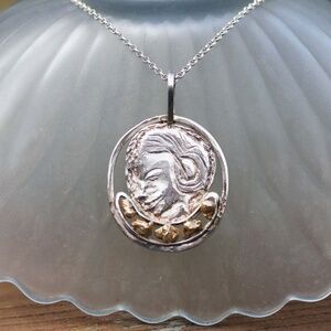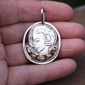 This unique pendant was hand-carved in wax, molded, cast, and finished by a Canadian goldsmith. It features a serene female profile framed in sterling silver, with warm-toned silver nuggets beneath the face for added artistic detail. A bold, meaningful statement piece—perfect for gifting or collecting.