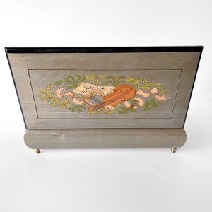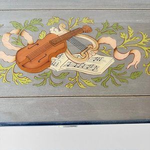 ERCOLANO Wooden Music Jewellery Box 'Violin' is handcrafted in Sorrento, Italy, finished grey maple wood veneer, coated in a high gloss lacquer, maple veneer This beautiful musical box is fitted with musical movement and is wound from underneath. When this lovely lid is lifted it reveals a grey lined jewellery compartment with a clear cover that offers a view the precision musical movement made in SWITZERLAND that plays the melody 'SWAN LAKE".