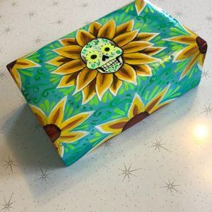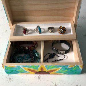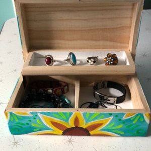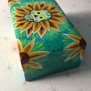 One-of-a-kind handcrafted jewelry box beautifully handpainted with yellow floral motif and sugar skull. Measures 8.25โ long x 5โ deep x 3โ tall - three compartments inside. Purchased at artisan shop in Mexico - has never been used. A simply stunning piece!