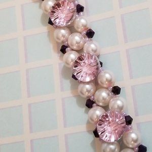 Add a touch of sparkle and elegance to your jewelry collection with this handcrafted pink lucite bead bracelet. Featuring sparkly pink lucite beads, white glass pearls, pink seed beads, and purple metallic bicone beads, this bracelet is a one-of-a-kind statement piece perfect for everyday wear or special occasions.
