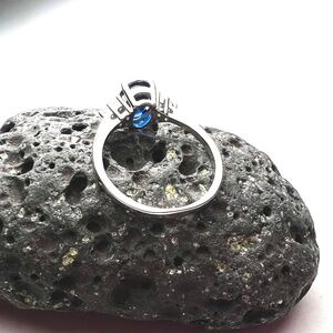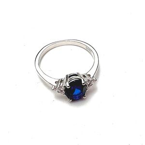 This beautiful ring features a bright, vivid blue sapphire complemented by sparkling cubic zirconias. Elegant, timeless, and perfect as a promise ring, engagement ring, or a meaningful gift.