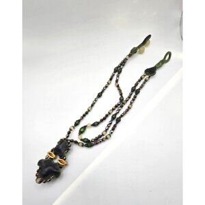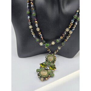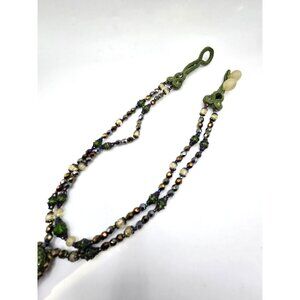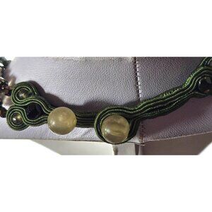 This exquisite eastern european vintage necklace is a standout artisan piece, acquired from an estate sale where it was carefully preserved and wrapped—clearly cherished by its previous owner. Featuring meticulous soutache embroidery, this handcrafted design combines rich green tones, shimmering metallic beads, and striking rhinestone accents to create a true statement necklace.
