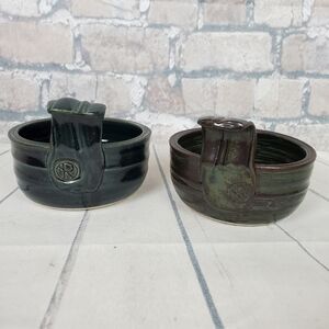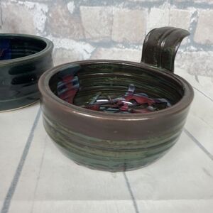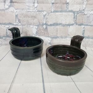 Handcrafted Studio Pottery Handled Soup Bowls Multicolored Glaze Set of 2