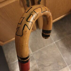 This beautiful walking stick tells a story with its vivid tribal designs. Handcrafted in Cozumel, Mexico, it combines both functionality and artistry. Ideal for collectors and those seeking a unique walking companion.