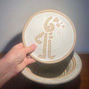 Handcrafted art pottery bowl with lid white glaze marked