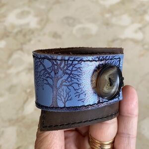 In excellent preowned condition lovely handcrafted leather cuff style bracelet. Soft brown leather and blue painted trees design. Horn button and elastic closure make this bracelet one size fits all.