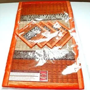 NWT Beautiful handicraft Reed placemats and coasters set (8 pieces)with pretty silk trim. Length: 18.5 " Width: 11.5"