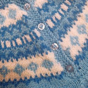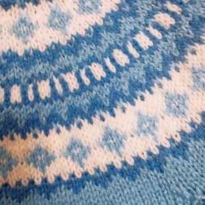 Handknit blue and white sweater with fair isle pattern. In excellent pre-owned condition.