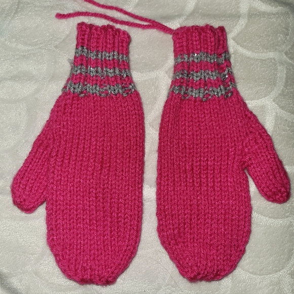 Cozy pink mittens with gray accents. Perfect for winter warmth. smoke and pet free