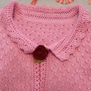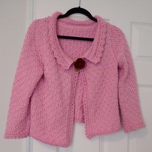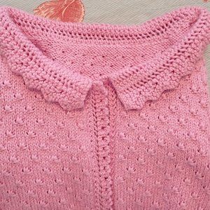 This beautiful handknit Victorian/Edwardian-inspired garden party/tea time cardigan is in need of a new owner who will love it! *All* the cottagecore, prairiecore, and vintage vibes, with an adorable dainty lace trim around the collar and cuffs and a cute textured shell-like pattern. No buttons along the front opening, can be pinned at the top with a brooch (please note that the rose brooch in the pictures is not for sale and is shown for demonstration purposes only).