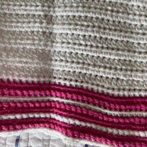 This gorgeous cardigan is a nice heavy cotton boxy fit. White with bright pink flowers and bright pink edging. Such a beautiful piece for spring!