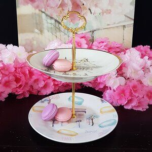 Two tier stand, handcrafted by me, using vintage pastel patterned ceramic plates, paired with new gold-tone hardware