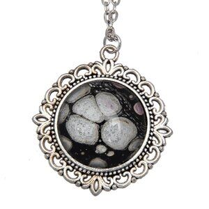 Handmade abstract pendant with swirls of silver and black, framed in a silver-tone filigree flower. One-of-a-kind statement necklace that adds a pop of color + boho-chic style. Perfect gift or unique accessory!