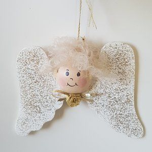 A cute wooden painted and decorated ornament with an angel head with fluffy hair and wooden glittery wings.