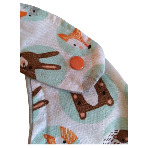 Handmade 100% cotton double lined baby bibs. Clasp off to the side for easy clipping. Machine washable.