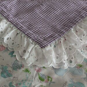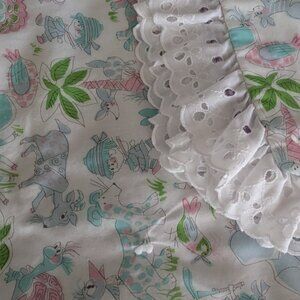 This sweet handmade crib quilt has been hand tied and is edged with 2.5 inch white cotton eyelet edging (ruffled and scalloped), The main fabric is a soft blend of pastel colors of multiple whimsical animals and on a white background. It appears to be a cotton blend as there is very slight pilling on the top. The animals range from alligators, cats, turtles, dogs, birds to elephants and horses. The quilt is backed with a purple and white gingham.