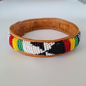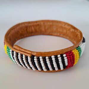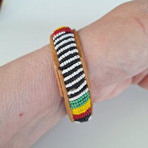 Pre Owned and gently used handcrafted seed bead and leather bangle bracelet that will fit a larger wrist.