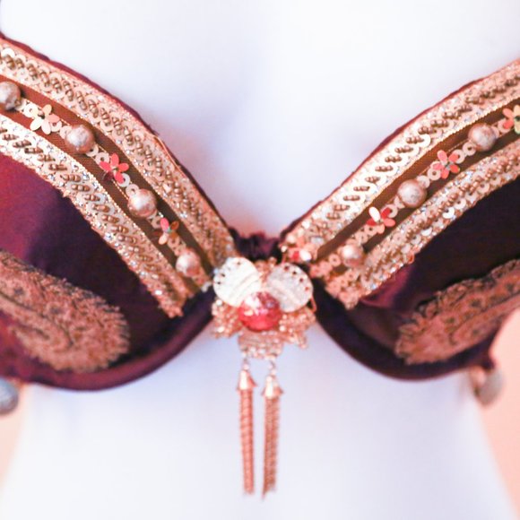Deep purple satin-like material covers a B cup bra with significant padding for push-up effect. Trimmed in gold adornments and vintage paisley. Straps tie around the neck and clasp with 2 button options around the mid-back. Worn approx. 4 times for performances. I also have bottoms made to match the top: see "Golden Bootie Harem Pants with Hip Cutouts".