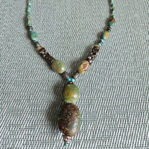 This is a beautifully handcrafted necklace with a variety of semi-precious stones and beads on a silver chain.
