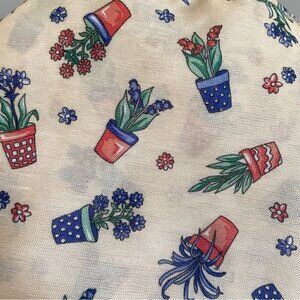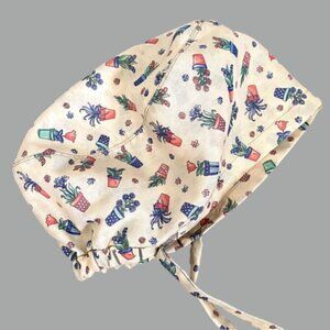 Vintage-y, hair bonnet with potted plants pattern. No tags, but material is lightweight, feels like a cotton blend.