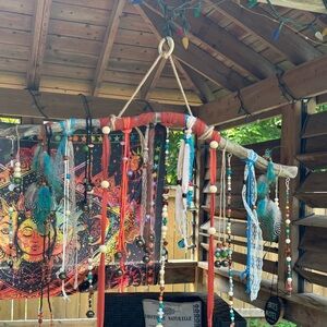 Measuring 30” wide x 30” long, each chime features handpicked glass beads, sari fabric strands, and soft, airy lace. Tiny bells add a delicate sound as the breeze flows through, creating a peaceful and enchanting atmosphere.