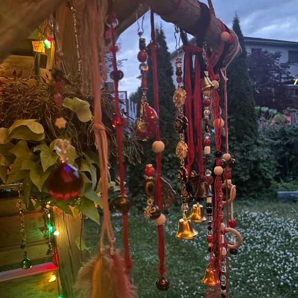 Measuring 30” wide x 30” long, each chime features handpicked glass beads, sari fabric strands, and soft, airy lace. Tiny bells add a delicate sound as the breeze flows through, creating a peaceful and enchanting atmosphere.