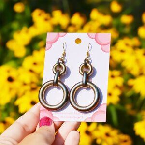 Handmade, contemporary statement loop earrings with a bronze, mixed-metal look. Made using upcycled materials harvested from a broken necklace. Despite their size, the earrings are quite lightweight. A modern and sustainable addition to any jewelry collection!