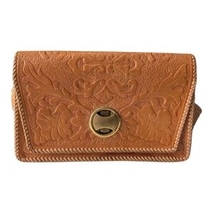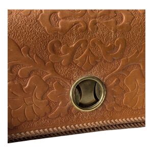 Floral filigree tooling/embossing on the front flap. Brass turn locking latch.