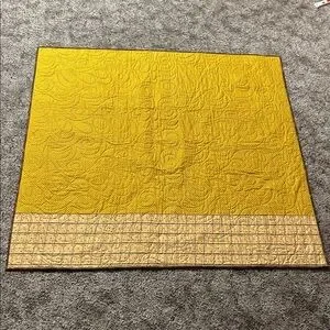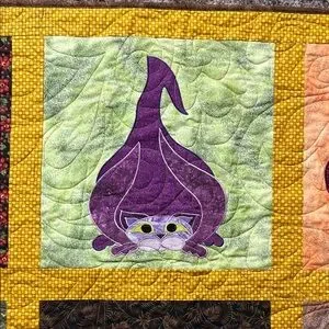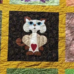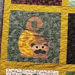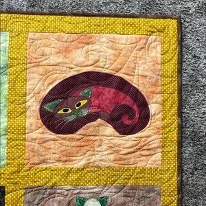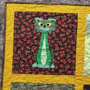 Colorful patchwork quilt featuring nine whimsical cat panels. Bright yellow border and green, orange, purple, brown and cream panel accents. Playful, folk-art cat appliqués. Cozy and decorative addition to any cat lover's space.