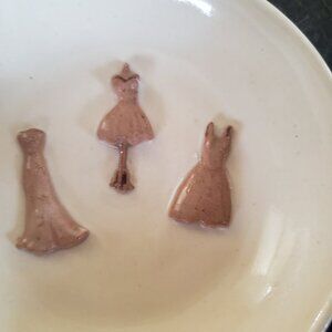 -Dresses are a warm brown color; dish is glossy off-white/light beige