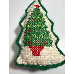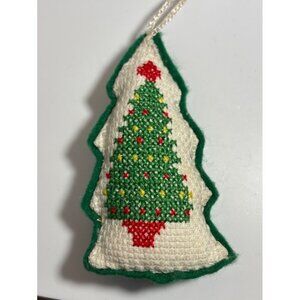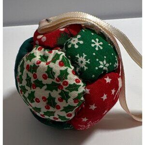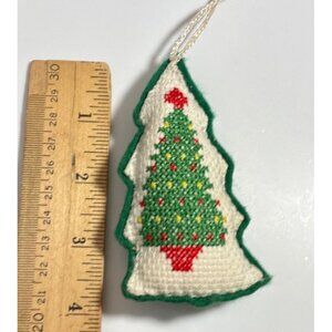 This set of handmade Christmas ornaments offers a charming addition to any holiday decor. Featuring a tree-shaped cross-stitch piece and a patchwork ball, each ornament is intricately crafted. Ideal for hanging on a tree or using as festive decor throughout your home.