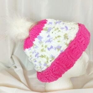 Stay cozy with this handmade, super chunky beanie featuring a faux fur pom. Knit in pink, white, purple, and gray yarn for ultimate softness and warmth.