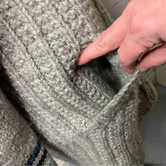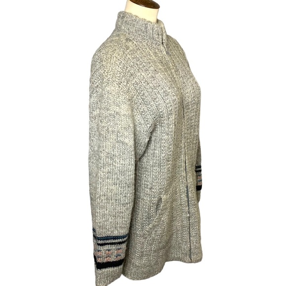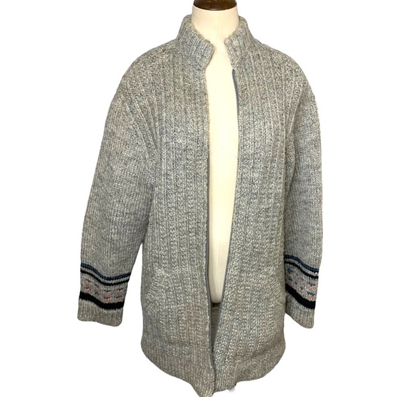In great condition, well made thick heavy handknit zippered sweater, nice gray whit black fuzziness, blue pink and black knitting details on sleeves. Mock neck style. 2 side pockets.