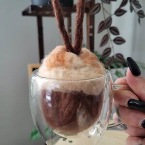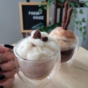 Transform your space with this charming handmade wool needle felted coffee cup decoration. This delightful miniature art piece features a double-walled glass mug filled with what appears to be a rich, dark coffee beverage, topped with an imaginative cotton candy-like whipped cream creation and adorable brown wool needle felted details. Perfect for creating a cozy atmosphere in any room, this unique decorative piece combines the warmth of traditional wool crafting with contemporary minimalist design. eye-catching accent piece for your home or office space, this miniature brings the comfort of café culture into your décor. Each piece showcases meticulous craftsmanship, making it a conversation starter that adds character to any shelf, desk, or display area.