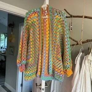Brighten your wardrobe with this vibrant crochet open-front sweater. Perfect for layering, this multicolored piece adds a pop of color to any outfit.