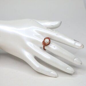 This unique ring features intricate copper wire-wrapped detailing, securely holding a polished ceramic bead. The bead is white with beautiful, natural-looking grey veins, giving it a classy, marble-like appearance. This is a perfect statement piece for anyone who loves artisan, bohemian, or minimalist jewelry.
