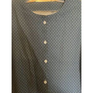 Crafted with care, this vintage cotton dress is a testament to timeless style and comfort. Featuring a delightful geometric pattern in a serene shade of blue, it's a perfect pick for those laid-back spring and summer days. The knee-length cut, coupled with a flattering scoop neck and cap sleeves, makes it an easy choice for casual outings or weekend get-togethers.