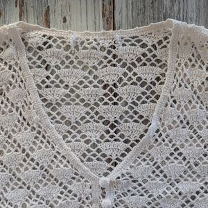Handmade Crochet Cardigan with front frog closure and long sleeves.