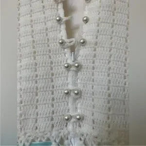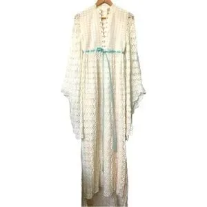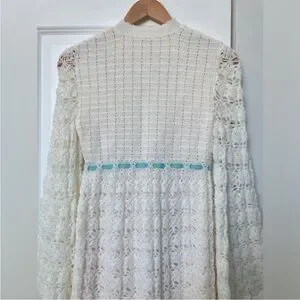 Handmade Crochet dress Pearl Button Front Baby Blue Satin Bow Bell Sleeves Cream