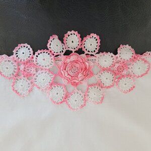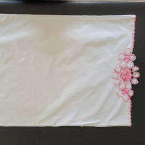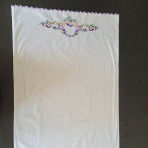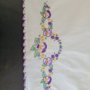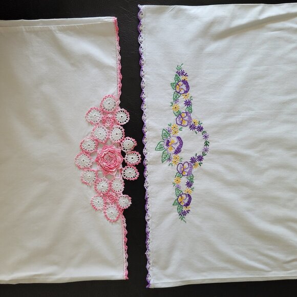 Vintage hand crafted purple and yellow pansy embroidery design and pink and white flower crochet design on cotton pillowcases. Clean, a few minor marks on pillowcase cover, no holes or significant wear indications.
