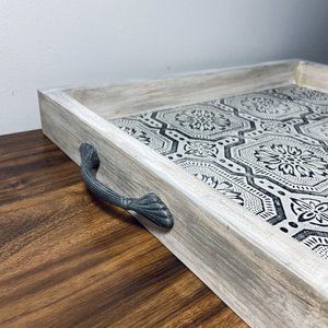 This farmhouse-inspired tray effortlessly combines the rustic charm of a bygone era with the simplicity of modern design. Its vintage black and white wallpaper interior backdrop serves as the perfect canvas to highlight the tray's beauty, creating a harmonious blend of classic and contemporary elements within your living space. 13.25 inches wide, 19 inches long and 2 inches high.