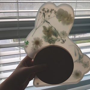 I made this rabbit mug holder. It’s cast with resin and silicone (non toxic craft silicone) with dried flowers embedded in it. The mold came from a chocolate box. I love the curvature of the shape and the color tones. It’s slightly see through and so fun to touch haha!!! Would be so cute as a personal gift.