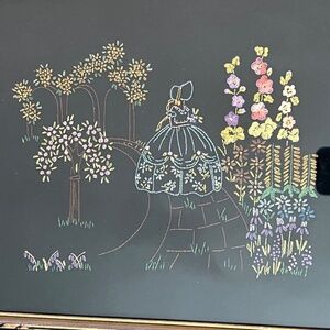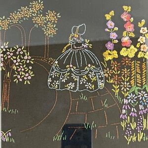 Handmade Embroidered Southern Belle Garden Flowers Framed Art on Black Vintage