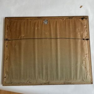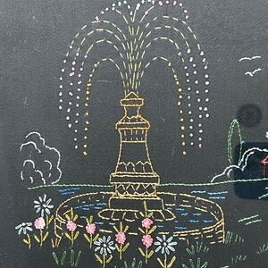 Handmade Embroidered Water Fountain Cabin Flowers Framed Art on Black Vintage