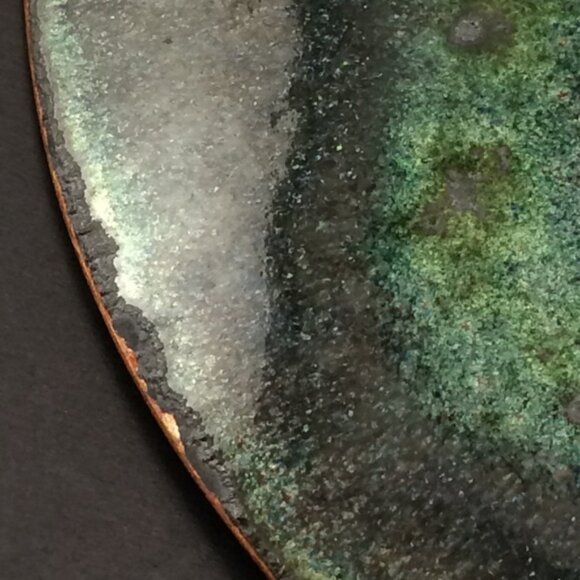 Plate is vintage and has design flaws and damage. Form is imperfect. Plate is very wobbly and not a perfect circular form. Center design done with a glass resin or glass detailing, has one raised clear glass chunk protuding. Doubtful that this was intentional. Finish has chipping throughout, most notably to back. Several spots where copper clearly shows through. Has surface scratches.
