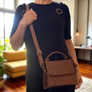 Beautiful handmade crossover bag created with genuine cow leather. It includes a zipper on the top to keep your items secure and a long, adjustable, removable leather strap. Fully lined inside. The perfect small to medium compact bag has enough room for your wallet, phone, and more.