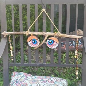 👁️ Add a bold, eye-catching twist to your outdoor decor with this handmade driftwood hanging, featuring two vividly painted eyeballs, subtle beading, and softly jingling bells.