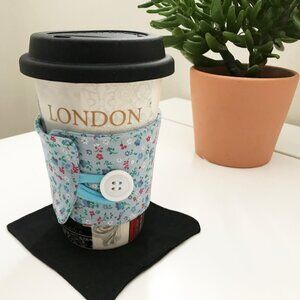 Handmade Fabric Coffee Cozy - Reusable Coffee Cup Sleeve, Blue Floral